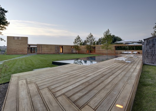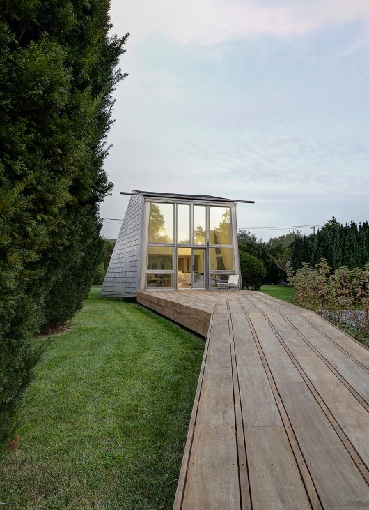 In beachfront construction, the boardwalk provides a unifying accessibility that connects disparate elements of building and landscape; it is an extension of building that is knit within the landscape. This design for a vacation home in Water Mill, New York, utilizes a boardwalk as an architectural device for weaving together multiple portions of a historic site with new building and landscape elements.