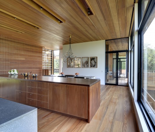 A new central lawn is defined as the boardwalk wraps to extend through the main house. A cantilevered deck wraps the end of the main house at the termination of the path, providing views of the sloping wetland and creek. The surface of the path folds up and over to become the enclosure of the main house, simultaneously functioning as floor, wall, and roof. All surfaces of this enclosure are constructed with the same wood decking as the boardwalk. Their uniformity gives the effect of a single envelope containing a variety of parts and reflects the influence of design in Geller’s work. In these ways the physical, material, and spatial qualities of the path facilitate an architectural dialogue between the Geller structures and new house that is interwoven with the existing landscape, collecting the once individual elements into a unified whole.
